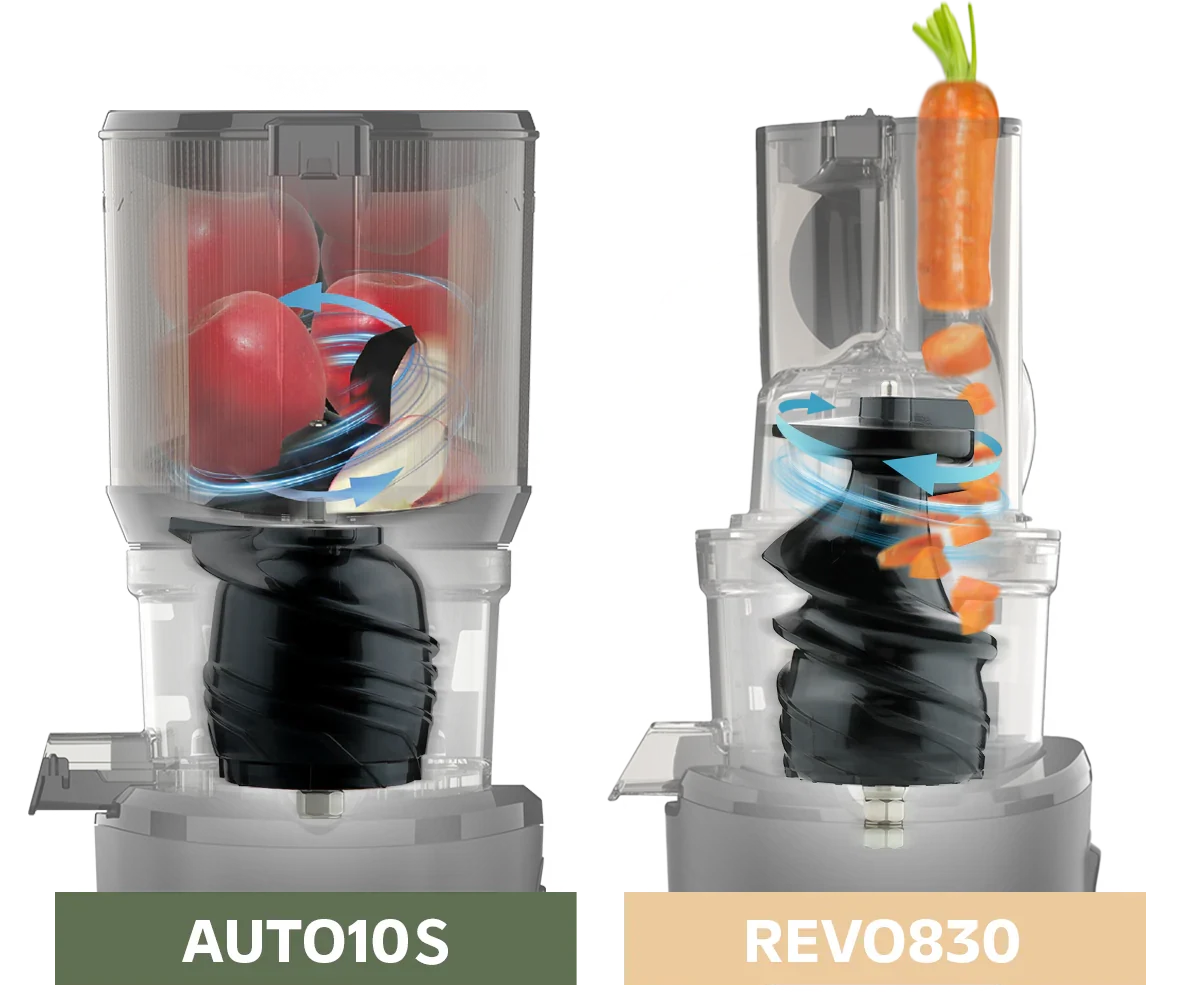 While both models share the same core technology, their hoppers are not interchangeable due to their unique auger (screw) design and juicing mechanism.