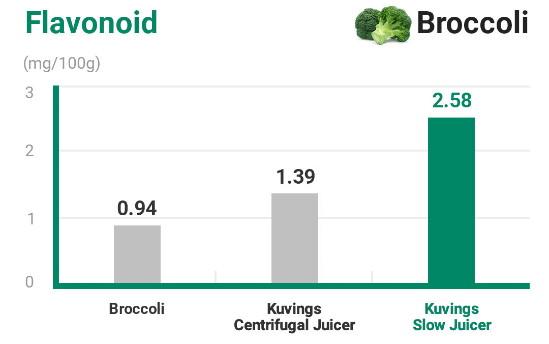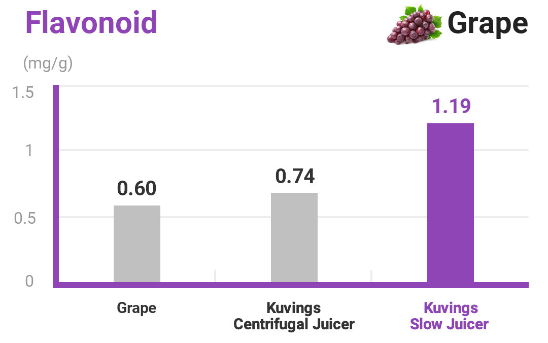 Flavonoid : Juice from a slow juicer contains 1.5 times more flavonoids than fruit and juice from a centrifugal juicer