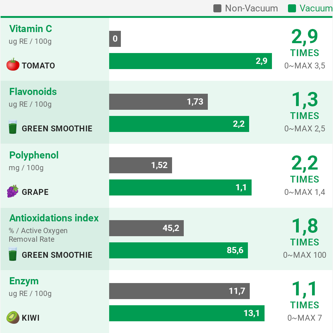 Vacuum technology prevents food oxidation and provides the highest level of vitamins and nutrients compared to our conventional centrifugal blender.