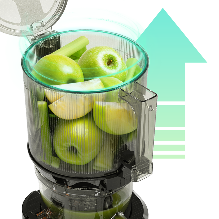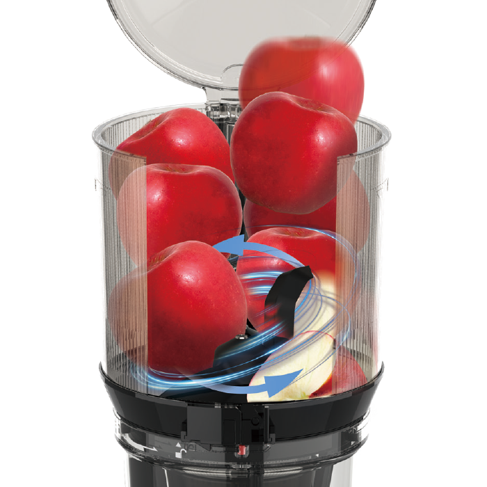 By applying an automatic cutting mechanism, the double crushing blade of the upper container is designed to automatically cut the entire input material and quickly transfer the cut material to the juicer.