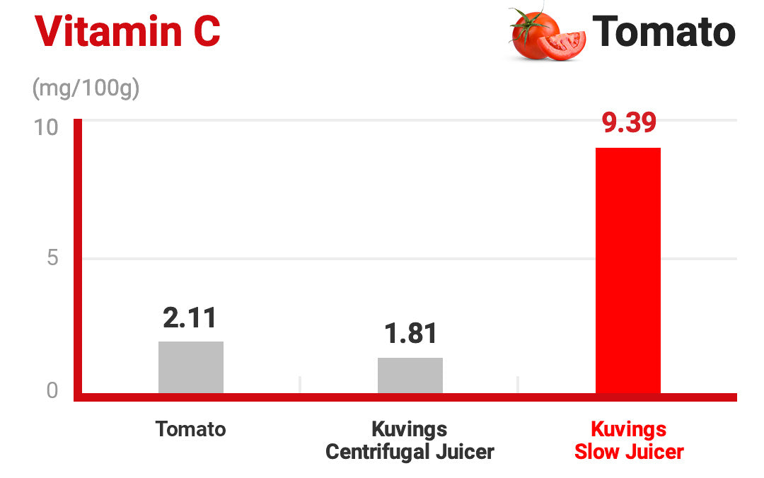 The content of vitamin C in the juice prepared by a slow juicer is 5.2 times higher than the vitamin C in the juice of a centrifugal juicer. Oxidation is another reason for low vitamin C levels